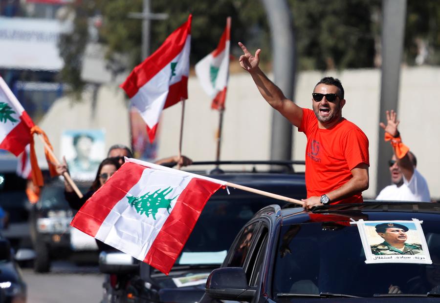 当天早些时候,成千上万的奥恩支持者参加了贝鲁特郊外的一次集会,其中一些人挥舞着他的自由爱国运动党的橙色旗帜,吞噬了通往总统府的主要道路。