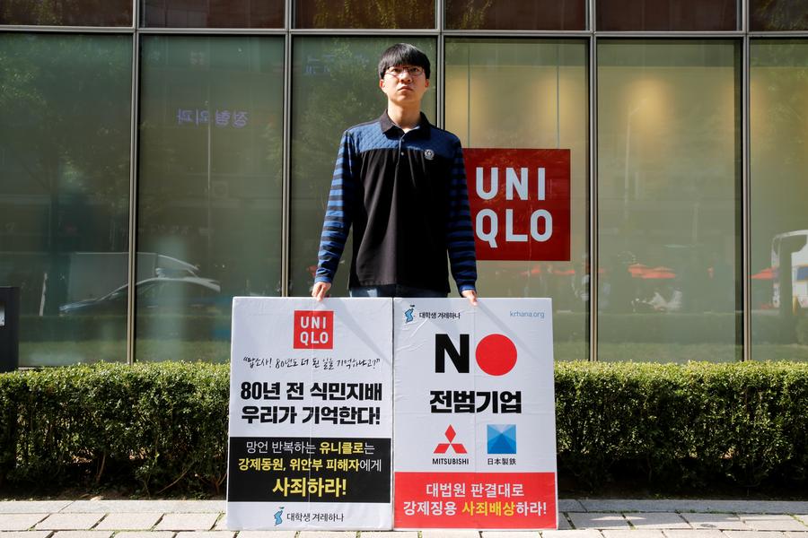 22岁的Bang Seulkichan参加了在首尔优衣库商店的示威游行,并举着标语:“ 80年前的殖民统治-我们记得!”