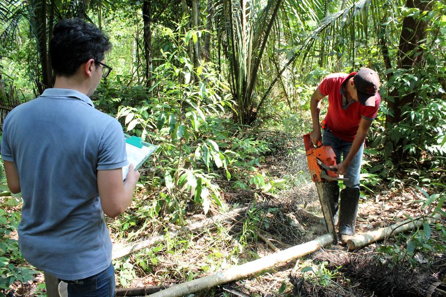 戴着大砍刀和卡尺,汗水浸透的科学家数着亚马逊的碳